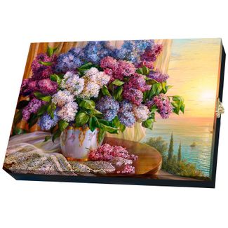 Настенная ключница-картина "Сирень" - это то, что нужно, чтобы освежить привычный интерьер в Вашей прихожей. Эта декоративная ключница размером 34245 см, вмещающая до 7 связок ключей во внутреннем отсеке 31.521.53.5 см, выполнена в виде картины на холсте поверх светлого корпуса (цвет белёного дуба).