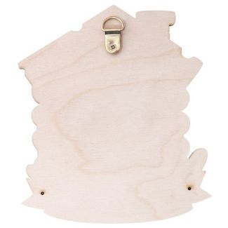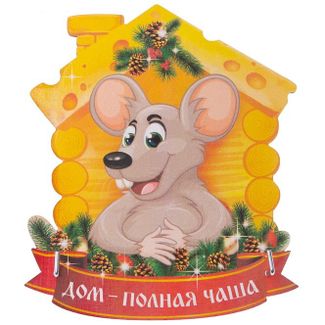 Открытая настенная ключница "Сырный дом" представляет собой деревянное панно оригинальной формы с нанесённым рисунком в виде забавной мышки в сырном домике, на котором закреплены два металлических крючка для ключей.