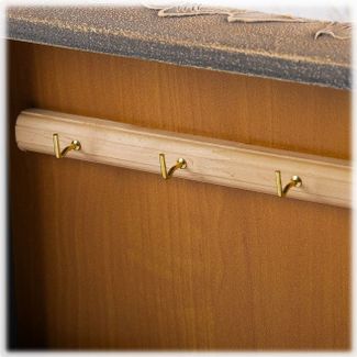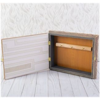 Размер ключницы 27*22*6 см. Она оснащена 3 удобными крючками для ключей, оборудована петлями для настенного размещения и элегантным замочком, фиксирующим дверцу. Внутренняя часть ключницы - 23*18*4 см.