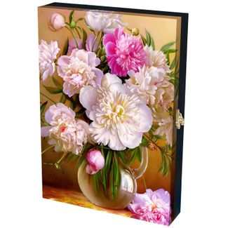 Настенная ключница-картина "Букет пионов" - это то, что нужно, чтобы освежить привычный интерьер в Вашей прихожей. Эта декоративная ключница размером 34245 см, вмещающая до 7 связок ключей во внутреннем отсеке 31.521.53.5 см, выполнена в виде картины на холсте поверх светлого корпуса (цвет белёного дуба).