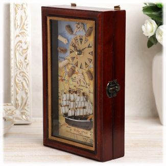 Ключница размером 25*15*6 см выполнена из дерева и оснащена 4 крючками во внутреннем отсеке для ключей 23*13*2,5 см с флоковым покрытием. Декор морской тематики на дверце ключницы расположен за стеклом.