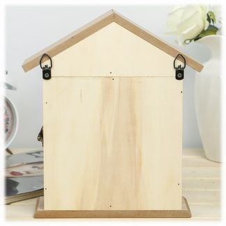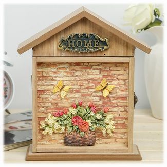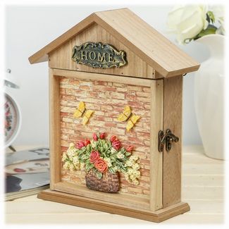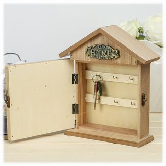 Ключница в прихожую размером 25*22*7 см изготовлена из дерева, оборудована 6 крючками для ключей и петлями для настенного размещения, оснащена крючком, фиксирующим дверцу. Размеры внутреннего отсека 15*15*4 см подойдут для удобного расположения шести связок ключей.