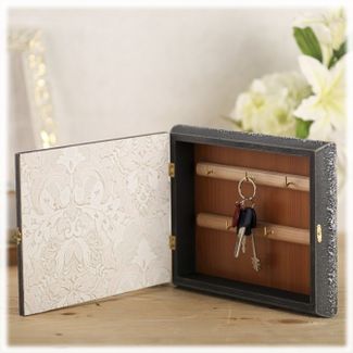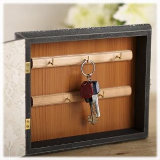 Размер ключницы 27*22*6 см. Она оснащена 5 удобными крючками для ключей, оборудована петлями для настенного размещения и элегантным замочком, фиксирующим дверцу. Внутренняя часть ключницы - 23*18*4 см.