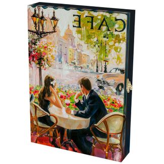 Настенная ключница-картина "Уютное кафе" - это то, что нужно, чтобы освежить привычный интерьер в Вашей прихожей. Эта декоративная ключница размером 34245 см, вмещающая до 7 связок ключей во внутреннем отсеке 31.521.53.5 см, выполнена в виде картины на холсте поверх светлого корпуса (цвет белёного дуба).