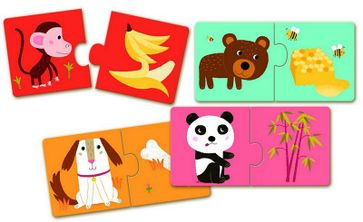 Настольная игра Djeco пазл-дуо К столу! познакомит ребенка с милыми животными и расскажет ему, кто чем питается. Косолапый мишка кушает мёд, панда грызет бамбук, собачка обожает грызть косточки, а обезьяна лакомится бананами. Возраст ребенка: от 2 лет.