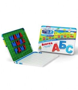 Магнитная Азбука Magneticus Путешественник с заданиями - набор, состоящий из букв русского алфавита, цифр и математических знаков на магнитной основе. Жестяная коробка является одновременно хранилищем для элементов набора и своеобразной рабочей доской для выкладывания слогов, слов и арифметических примеров. С таким набором время в дороге будет использовано с пользой!