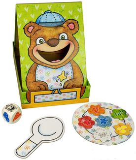 «Чем кормить Мишутку?» - это игра на развитие памяти. Игрокам предстоит по очереди открывать карточки еды и искать соответствующие пары: одной частью игрок кормит мишку, а вторую – забирает себе. Побеждает тот, кто соберет больше карточек.