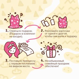 Характер игры: на подумать Предмет: математика Игроков: от 1 Время игры: 10 мин. Сделайте поиск подарка увлекательной игрой! Вручите подарок эффектно при помощи забавного квеста по квартире! В этой коробочке — набор различных интригующих подсказок, которые приведут к подарку: 4 карты со скретч-слоем 3 карты со скрытым изображением 3 карты-пазла из 6 частей 7 конвертов Письмо, начинающее квест Фигурка принцессы, начинающая квест 2 комплекта наклеек: для украшения подарка и стрелки для навигации Инструкция Минимальная сумма заказа 500 руб.