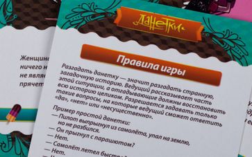 От 2 игроков Партия 10-40 минут В этой коробке 35 карт с необычными историями. Играть очень просто: ведущий берет карточку и зачитывает с нее описание, а остальные, задавая вопросы на "да" и "нет", должны понять, что же произошло на самом деле. Детектив, разгадывание загадок и игра на логику, внимательность и воображение — все это в одной коробке. Приятный подарок Возьмите сразу две коробки: вторая будет замечательным небольшим подарком на все случаи жизни. На вечеринке или в гостях Отгадывать истории можно даже очень большими компаниями — это безумно увлекательно. Не менее интересно брать "Данетки" на пикники или выезды на дачу. Возьмите в дорогу В "Данетки" можно играть в машине, самолёте, автобусе, даже на подложке — это идеальная игра для дороги. Поиграть в кафе "Данетки" здорово подходят для игры за столиком в кафе в дружеской компании. None