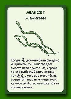 Количество игроков: 2-4 Среднее время игры: 30-60 минут Сегодня на Земле обитает около 8,7 миллионов видов живых существ — от одноклеточных до млекопитающих. Гораздо больше видов — около полумиллиарда! — населяло нашу планету в прошлом, но до наших дней не дожило. Все эти существа появились на свет — и покинули его — благодаря одному-единственному процессу эволюции, суть которого можно описать в трёх словах: выживает наиболее приспособленный. "Эволюция" — это настольный симулятор развития жизни на Земле, основанный на дарвиновском принципе естественного отбора. Каждый игрок развивает собственную популяцию живых существ, наделяя их разнообразными свойствами — приспособлениями к условиям окружающей среды. Свойства помогают животным в борьбе за пищевые ресурсы, запасы которых ограничены и непредсказуемо меняются со временем. Существа, которым не досталось пищи, погибают, а выжившие позволяют ввести в игру ещё больше животных и свойств. Победителем становится тот из соперников, чья популяция будет к концу игры самой развитой и многочисленной. Живые существа и их свойства представлены в игре картами. На их рубашке изображена ящерица — символ животного. Каждая карта, которая лежит на столе перед игроком рубашкой вверх, считается одним из его существ. На лицевой стороне карты указано свойство: "Хищник", "Водоплавающее", "Симбиоз", "Мимикрия" — всего 19 разных. Свойство можно разыграть только на животное: при этом карта подкладывается под существо лицом вверх, — чтобы все игроки видели, каким свойством теперь обладает это животное. На некоторых картах указано сразу два свойства: в таком случае игрок должен выбрать, каким из них он хочет наделить своё существо, и повернуть карту нужной стороной вверх. Когда животное погибает (от голода или по иной причине), оно вместе со всеми своими свойствами отправляется в сброс хозяина. Каждый участник начинает игру с шестью картами на руке. Партия длится несколько ходов — обыч