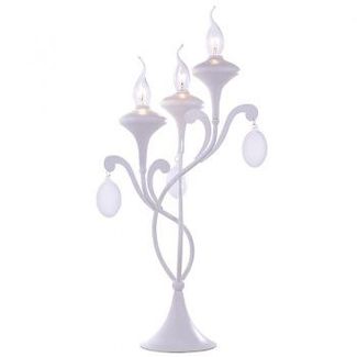 Очень красивый нежный светильник в романтичном стиле напоминающий три белоснежные свечи. Каркас-подставка украшен овальными металлическими подвесками-медальонами. Оригинальная настольная лампа A3239LT-3WH изготовлена из гальванированного металла итальянской компанией Arte Lamp и рассчитана на три небольшие лампочки. Минимальная сумма заказа 2000 рублей Страна производства: Италия