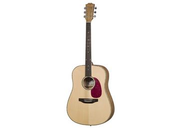 Форма корпуса - Дредноут (Western) Верхняя дека - Ель (шпон) Корпус - Махагони (шпон) Гриф - Красное дерево (шпон) Накладка и подставка - Палисандр Колки - Хром Цвет - Натуральный Окантовка - перламутр Струны - Металл None