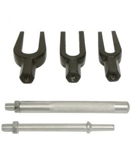 Универсальный комплект для демонтажа шаровых опор и рулевых тяг легковых автомобилей, а также легкого коммерческого транспорта. Комплектация “Вилка” зев 18 мм – 1шт. “Вилка” зев 24 мм – 1шт. “Вилка” зев 28 мм – 1шт. Рукоятка держатель – 1 шт. Адаптер для пневмолотка – 1 шт. None