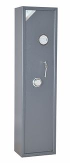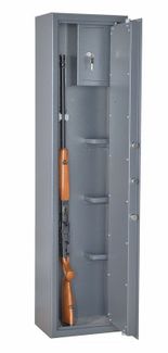 имеет корпус толщиной 3 мм, дверь толщиной 5 мм. сейф полностью соответствует требованиям МВД России на задней стенке и днище корпуса расположены отверстия для крепления шкаф односекционный оснащен съемными полками и отделением под патроны ложементы — роликовые максимальная высота устанавливаемого оружия — 1380 мм. в дверь установлены ключевой 8-ми сувальдный замок с ригельной системой запирания в 3 стороны и электронный замок серии D-126 диаметр ригеля 20 мм. ключевой замок ЗАО «Про-Сам» г. Рязань или аналогичный замок другого производителя цвет: серый в комплекте 3 полки; высота ствола - 1380 мм. трейзер - внутреннее отделение, запираемое на ключ None