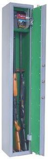 корпус сейфа СО-3 толщиной 3 мм, дверь толщиной 5 мм.; на задней стенке и днище корпуса расположены отверстия для крепления; сейф односекционный, на 3 ствола высотой 1350 мм., оснащен отделением под патроны; внутренняя поверхность сейфа покрывается ФЛОКОМ;изнутри дверь усилена фальшпанелью;на двери шкафа расположены шомполодержатели и приспособление для хранения масленки;ложементы — ДЕРЕВО; максимальная высота устанавливаемого оружия — 1300 мм. ; в двери установлен немецкий ключевой 8-ми сувальдный замок Mauer с ригельной системой запирания в 3 стороны, диаметр ригеля 20 мм. Второй замок ЗАО «Про-Сам» г. Рязань или аналогичный замок другого производителя; цвет: серый. None