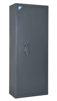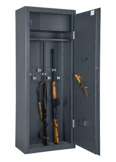 корпус сейфа толщиной 3 мм, дверь толщиной 5 мм.;на задней стенке и днище корпуса расположены отверстия для крепления;сейф СО-8А оснащен отделением под патроны и одной полкой;комплектуется ложементами на 8 стволов, которые переставляются по высоте;изнутри дверь усилена фальшпанелью;на двери шкафа расположены шомполодержатели и приспособление для хранения масленки;дно шкафа закрывается ковролином;максимальная высота устанавливаемого оружия — 1430 мм. ;в двери установлен немецкий ключевой 8-ми сувальдный замок Mauer с ригельной системой запирания в 3 стороны, диаметр ригеля 20 мм. Второй замок ЗАО «Про-Сам» г. Рязань или аналогичный замок другого производителя;диаметр ригеля 20 мм.;предусмотрено крепление к стене по 2-ум точкам;цвет: серый;покрытие: полимерная краска. None