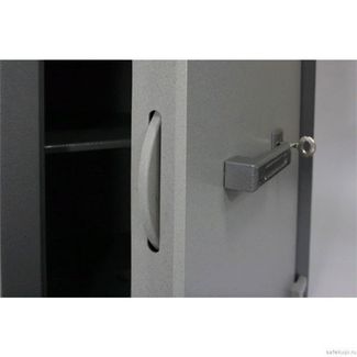 в сейфах применена сложная многослойная конструкция корпуса, обеспечивающая двойное назначение и против огня, и против взлома. Толщина металла на дверцах сейфов 10 мм, затем следует слой особого бетона и опять стальной лист; комплектуется электронным замком LAGARD (США), замки защищены от высверливания пластинами очень твёрдого металла. Запорные ригели дверцы сейфа запираются на все четыре стороны; цвет: серебристо-серая высокопрочная эмаль; внутри сейфа касса и полка, регулируемая по высоте; глубина ручки 38 мм. None