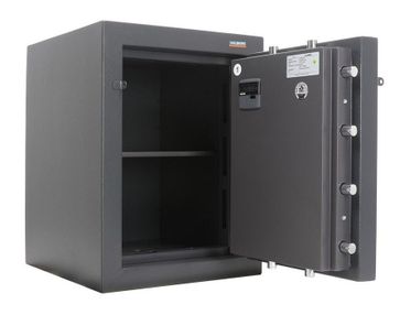 Сейф предназначен для хранения ценностей в условиях дома, офиса, предприятия, банковского хранилища. Комплектуется 2-мя полками. Цвет сейфа - графит. Сейф обладает очень плотными стенками: толщина боковых стен - 55 мм. толщина дверной панели - 100 мм.