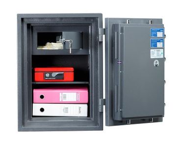 корпус сейфа состоит из двух сваренных между собой стенок,выполненных из стального листа толщиной 1,5 мм; дверь сейфа - четырехстенная толщиной 134 мм.; пространство между стенками корпуса и двери заполнено огнестойким бетоном; оснащен электронным кодовым замком Mauer (Германия), имеет 4-стороннюю ригельную систему запирания, а также систему блокировки ригелей, защищающую замкок от высверливания; комплектуется одной полкой и внутренним запираемым отделением (трейзером); возможно крепление к полу. None