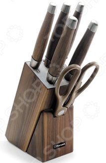 Набор ножей Rondell Glaymore отличные инструменты со своими функциональными предназначениями. Ножи помогут вам справиться с приготовлением самых разнообразных блюд из мяса, птицы, рыбы или овощей и прочее. Это качественные, практичные, надежные и при этом недорогие ножи, которые всегда пригодятся вам в хозяйстве и будут служить очень долго. В наборе вы найдете: подставку; нож разделочный 20 см; нож поварской 20 см; Нож универсальный 11.4 см; нож для овощей 9 см; нож для хлеба 20 см; кухонные ножницы. Лезвия выполнены из высококачественной нержавеющей стали, предотвращающей налипание продуктов, материал ручки экологически чистый дерево ореха. Эргономичные рукоятки ножей, выполненные из качественного материала, обеспечивают безопасную работу и комфортное положение в руке. Также изделия легко отмываются после использования, на это не уходи много времени. В наборе есть подставка для ножей и других аксессуаров, что идут в комплекте. Готовьте с удовольствием! Качественный материал, не вступает в реакции и не влияет на вкусовое качество блюда. Современный дизайн сделает набор украшением вашей кухни. Предметы из набора позволят виртуозно и в короткое время приготовить вкуснейшую еду для ваших родных и близких. Эргономичная ручка с прорезиненным покрытием обеспечивает безопасность положения руки и комфортное использование. Лезвия острые и отличаются наличием двусторонней заточки. Толщина клинка составляет 2,5 мм. Твердость по шкале Роквелла 56-57 HRC. None Возможен самовывоз. Есть доставка.