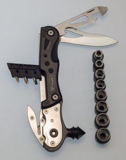 Универсальный инструмент - аварийноспасательный комплект с фонариком MS005 для автомобилистов. Основное лезвие, универсальный консервный нож с гаечными отверстиями. Стропорез для ремней безопасности. Твердосплавный пробойник для разбивания автомобильных стекол. 3 отверточные биты, ключ трещотка с 8 головками - 5/6/7/8/9/10/11/12. Инструмент имеет встроенный микрофонарь LED, удобный чехол с петлей для ношения на поясе. None