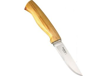 Черные кожаные ножны с тиснением «волчий след». Прекрасные прочностные характеристики клинка и надёжный хват рукояти. Общая длина: 220 ммДлина клинка: 90 ммДлина рукояти: 130 ммМасса: 90 гТолщина клинка: 3.2 ммМатериал клинка: сталь Sandvik 12C27Материал рукояти ножа: карельская берёзаТип режущей кромки: гладкаяМатериал ножен: кожа None