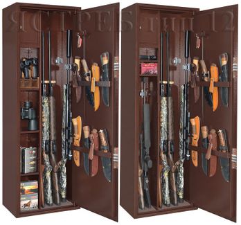 Внутреннее устройство: внутреннее устройство оружейного шкафа: запираемое (патронное) отделение и 3 съемные регулируемые по высоте полки. На внутренней стороне двери этого оружейного шкафа есть держатели для хранения ножей и крючки для хранения шомполов, ключей и т.п. Ружья можно хранить как по одну сторону от перегородки, так и по обе стороны от перегородки. Дно оружейного шкафа отделано ковролином. None