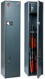Габариты внешние, ммвысота - 1385ширина - 300глубина - 285Габариты внутренние, ммвысота - 1368/1221ширина - 297глубина - 265 Электронный кодовый + ключевой замки на 3 ствола высота ствола: 1368 мм. None