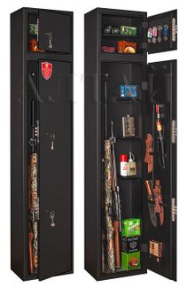 полностью удовлетворяет требованиям МВД для физических и юридических лиц; сейф имеет гигиенически безопасное износо- и коррозионно-устойчивое полимерно-порошковое покрытие на основе материалов производства Италии; сейф оборудован тремя сертифицированными трёхригельными замками второго класса; дверь основной (нижней) секции сейфа оборудована двумя замками, дверь верхней секции оборудована одним замком; петли – внутренние, двери сейфа имеют коробчатую конструкцию для дополнительного усиления; Внутри верхней секции - съёмная полка; на внутренней поверхности двери верхней секции имеются крючки для хранения связок ключей и т.п.; внутри основной (нижней) секции сейфа имеются 3 съемные полки; если устанавливать не все полки, то на их месте можно хранить дополнительные три ствола; на внутренней поверхности двери основной (нижней) секции сейфа имеются крючки для хранения шомполов и ключей, рамки для хранения ножей и т.п., а так же удобный лоток; дно сейфа отделано ковролином;3-6 стволовмаксимальная высота ствола - 1360 мм. предусмотрена возможность крепления сейфа к стене; по желанию заказчика возможна так же поставка в исполнении, предусматривающем крепление и к полу. None