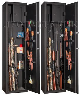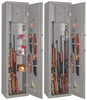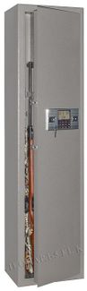 Высота ружей: 1130 мм. Замок: наружная дверь сейфа оборудована двумя замками: ключевым и высокоинтеллектуальным электронным кодовым. Сейф имеет систему аварийного открывания master-lock, которая позволит Вам открыть и перепрограммировать электронный замок Вашего сейфа, если забыт установленный Вами код и т.п. Индивидуальные мастер-ключи входят в комплект сейфа. Электронный замок сейфа имеет удобный дисплей с подсветкой. В режиме ожидания дисплей отображает текущий год, месяц, число, день недели и время. Также на дисплее отображается уровень заряда батарей. Предусмотрена функция просмотра статистики открываний сейфа с индикацией даты и времени открывания сейфа. Длина кодовых комбинаций электронного замка до 8 цифр. Два пользовательских кода - рабочий код и мастер-код. Оба кода программирует сам владелец. Защита: сейф имеет мощную сигнализацию-сирену, которая срабатывает при ударе по сейфу. Этот режим охраны при желании включает сам владелец сейфа нажатием одной кнопки. При ударе по сейфу сигнализация работает в течении 1 минуты, затем опять встаёт в режим охраны. Кроме того, сигнализацию может выключить только владелец сейфа, просто набрав свой правильный код. Также сигнализация обязательно автоматически включается – если три раза неправильно набран код. Сейф изготовлен из стали толщиной 3 мм. Дверь имеет коробчатую конструкцию для дополнительного усиления. Петли -внутренние из стали 6 мм. Внутренне устройство: запираемое (патронное) отделение и 3 съёмные полки. Внутри корпуса имеется крючок для хранения оружейно-охотничьей амуниции и др. На внутренней стороне двери сейфа имеются лоток, 2 рамки для хранения ножей, крючки для хранения шомполов, ключей и т.п. Дно сейфа отдела