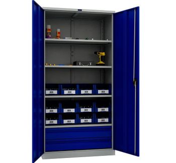 возможность индивидуально смоделировать шкаф, выбрав необходимые комплектующие и их расположение в шкафах; ригели из оцинкованной стали и пластиковые втулки обеспечивают бесшумный ход дверей и надежное запирание шкафа; комплектуются ключевыми замками с ручками (Burg GSC813, 2 ключа в комплекте); максимальная нагрузка на шкаф ТС 1995 – 500 кг.; максимальная нагрузка на полку - 80 кг.; шаг регулирования высоты полки - 50 мм.; цвет: серый полуматовый (RAL 7038), двери синие (RAL 5002); тип покрытия: порошковое поставляются в разобранном виде.