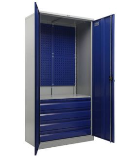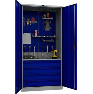 возможность индивидуально смоделировать шкаф, выбрав необходимые комплектующие и их расположение в шкафах; ригели из оцинкованной стали и пластиковые втулки обеспечивают бесшумный ход дверей и надежное запирание шкафа; комплектуются ключевыми замками с ручками (Burg GSC813, 2 ключа в комплекте); максимальная нагрузка на шкаф ТС 1995 – 500 кг.; максимальная нагрузка на полку - 80 кг.; шаг регулирования высоты полки - 50 мм.; цвет: серый полуматовый (RAL 7038), двери синие (RAL 5002); тип покрытия: порошковое поставляются в разобранном виде.