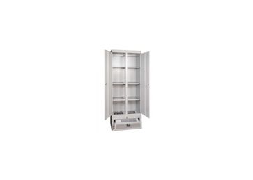 Температура воздуха внутри шкафа достигает 60°С, благодаря нагнетанию теплого воздуха электровентилятором АТН-130. Шкаф конструктивно состоит из двух основных элементов: шкафа и подставки, скрепленными между собой болтовыми соединениями. Две секции, каждая из которых закрывается на свой ключ. Внутри каждая секция комплектуется тремя подвесными сетчатыми полками и двумя перекладинами. На полки можно укладывать для сушки рукавицы, головные уборы или обувь. Cняв полки, на перекладины можно повесить одежду, как в один ярус, так и в два (детскую одежду). Подставка сушильного шкафа ШСО-22р имеет выдвижной ящик, в котором устанавливается электровентилятор АТН-130.