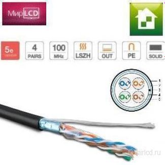 Ethernet CAT кабель на катушке. Спецификация Cat5e. Длина 500 метров. Кабель витая пара экранированный (F/UTP), 4 пары (24AWG), проводник одножильный (solid) медь электролитическая отожженная (BC), изоляция проводника (PVC), общий экран – в фольге алюминизированная полиэстерная пленка, внешняя оболочка (LSZH) для внешней проводки. Применение - Кабель с оболочкой LSZH может применяться внутри и вне помещений. Построение магистральной подсистемы СКС категории 5е в условиях повышенных электромагнитных помех, влаги и УФ излучения. Применяется для прокладки в кабельной канализации, шахтах и коллекторах. Может прокладываться снаружи стен зданий и сооружений. Передача сигналов 1 Гбит/с на частоте до 100 МГц. Поддерживаемые приложения - 10-1000 Мбит/с Ethernet (10BASE-T, Fast 100BASE-TX, Gigabit 1000BASE-T), ATM-622 Мбит/с, 100VG-AnyLAN, Token Ring, Firewire, другие приложения кабельных систем категории 5e. Low Smoke Zero Halogen – малодымный безгалогенный компаунд. Кабели с изоляцией проводников и внешней оболочкой из негорючего безгалогенного компаунда LSZH обладают свойствами малодымности и низкокоррозийности. Малодымность – кабель не распространяет горение, а при воздействии открытого пламени в случае пожара не выделяет дыма и чёрной сажи подобно материалам ПВХ, ПЭ и др. Низкокоррозийность – кабель изготовлен из специальных материалов, не содержащих высокотоксичных галогенов, таких как фтор, хлор, бром и йод. Возможные цвета оболочки: Черный. Производитель: США. None