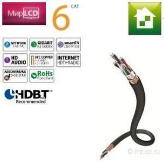 Ethernet CAT кабель на катушке. Спецификация Cat 6. Катушка 100 м. 1000Base-T HDBaseT Ethernet CAT кабель для внутренней проводки. Применение: Домашняя автоматизация, Lan / CATV общего назначения (10baseT Ethernet / 100baseT / 1000baseT), ISDN / DSL / телефон (аналоговый), передача медиа для жилых, коммерческих и общественных помещений. Скорость передач данных до 1 Гбит/с при использовании 4 пар. Рекомендовано альянсом HDBaseT. Производительность HDBaseT 550 MГц. Обеспечивает передачу без потери качества видео сигналов 4К и UltraHD на расстоянии до 100 м через HDBaseT. Четыре симметричных витых пары для закрытой проводки SF-UTP (экранированная витая пара, общий экран из фольги плюс общий экран из оплётки). Проводник: Твердый медный. Диаметр жилы, мм / AWG 0.511 / 24. Изоляция проводника: HDPE (полиэтилен высокой плотности). Разделитель (Separator). Экран AL Foil (Алюминиевая фольга). Разрывная нить Ripcord нейлоновая нить для легкого вытягивания и снятия оболочки. Оплетка: Медь высокой очистки. Оболочка: PVC (поливинилхлорид). Spool - намотка кабеля на катушку без использования коробки. Возможные цвета: Черный. Производитель: Германия. None