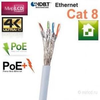 Ethernet CAT кабель на катушке. Спецификация Cat8. Длина 150 метров. Ethernet CAT кабель для внутренней проводки. Рекомендовано альянсом HDBaseT. Направление сигнала двунаправленное. Примеры применения Ethernet 40GBASE-T. Идеально подходит для всех приложений от D до FA и Class II, мультимедиа (ТВ, видео, данные, голос)> 40 GbE, IEEE 802.3 bq (draft), совместное использование каналов, VoIP и PoE / PoE +. Производительность HDBaseT 2000 MГц. Сопротивление 145 Ом / км. Емкость 43 пФ / м. Скорость передачи @ 100 МГц 5/100 нс / м. Импеданс 100 Ом. Коэффициент скорости 0.8xC (скорость света). Классификация по стандартам ISO / IEC 11801 и EN 50173 (второй выпуск), для компьютерных центров в соответствии с ISO / IEC 24764, EN 50173-5, а также TR 11801-99-1. Геометрия четыре симметричных витых пары S / STP PIMF (экранированная витая пара). Проводник бескислородная медь 5N > 99.999%. Размер проводника 0.23 мм2/26 AWG х 4P. Количество нитей проводника 7 шт. Изоляция проводника вспененный полиэтилен с низкой емкостью (PE). Внутренний экран алюминиевая фольга. Наружный экран бескислородная медная оплетка 5N луженая оловом. Оболочка огнестойкий и безгалогенный (FRHF) полиэтилен PE. Экранированный Ethernet кабель Supra Cat 8 - удивительная скорость и точность! Supra Cat 8 еще раз один шаг вперед в будущее, 40GBASE-T одним кабелем! Он выгодно используется в приложениях TCP / IP и UDP, где критически важны корректная передача данных без дрожания, например потоковая передача видео 4K и 8K, высококачественная потоковая передача музыки (например, 32 бит @ <700 кГц для загружаемой музыки и приложений в студии), игровые и дата-центры, инсталляционные объекты, такие как гостиницы, конференц-залы и другие. HDBaseT передается по кабелю Cat6A на расстояние до 100 м с модульными разъемами типа 8P8C, обычно используемого для локальных сетевых соединений Ethernet. Пропускная способность Cat8 в четыре раза превышает пропускную способность Cat6A. Supra Cat 8 позволяет использовать невероятную ск