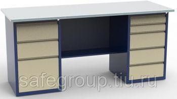 Монтажный верстак СВ-2Т.03.05.19 Монтажный стол Святогор СВ-2Т.03.05.19 создан из прочной холоднокатаной стали: каркас, обработанный полимерно-порошковым средством, обладает повышенной химической устойчивостью к разного рода веществам, а также механической порче; это значительно улучшает эксплуатационные характеристики изделия; не боится коррозии, отслаивание покрытия не происходит, поэтому стол имеет аккуратный первоначальный вид даже при активном проведении монтажных работ; рабочий стол монтажника станет более функциональной производственной мебелью благодаря продуманному оснащению дополнительными комплектами подкатных тумб, разнообразными модификациями навесного оборудования, удобными блоками из определенного количества розеток, вытяжными и антистатическими устройствами, системой заземления; сстолешница монтажного стола – МДФ 22 мм.+ 2 мм. оцинкованный лист; две тумбы с 3 - мя и с 5-ю выдвижными ящиками на телескопических шариковых направляющих; нагрузка на ящик 20 кг. None