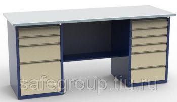 Монтажный верстак СВ-2Т.04.06.19 Качественный монтажный верстак должен иметь прочный каркас с надежной столешницей. Этим требованиям соответствует монтажный стол Святогор СВ-2Т.04.06.19 из холоднокатаной стали: 2 тумбы с 4 - мя и с6-ю выдвижными ящиками на телескопических шариковых направляющих; дополнительно пользователи могут приобрести подходящую подсветку, облегчающую процесс сборки деталей, оборудовать стол перфорированным металлическим экраном с разнообразными держателями для часто используемого инструмента, а также прочными, функциональным полочками; столешница монтажного стола – МДФ 22 мм.+ 2 мм. оцинкованный лист; нагрузка на полку тумбы 20 кг. None