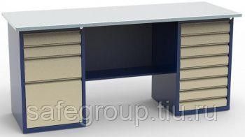 Монтажный верстак СВ-2Т.04.08.19 Качественный монтажный верстак должен иметь прочный каркас с надежной столешницей. Этим требованиям соответствует монтажный стол Святогор СВФ-2Т.04.08.19 из холоднокатаной стали: 2 тумбы с 4 - мя и с 8-ю выдвижными ящиками на телескопических шариковых направляющих; дополнительно пользователи могут приобрести подходящую подсветку, облегчающую процесс сборки деталей, оборудовать стол перфорированным металлическим экраном с разнообразными держателями для часто используемого инструмента, а также прочными, функциональным полочками; столешница монтажного стола – МДФ 22 мм.+ 2 мм. оцинкованный лист; нагрузка на полку тумбы 20 кг.; None