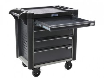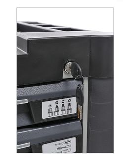Сварная конструкция, толщина металла корпуса 0,8 ммв комплекте 3 средних и 2 малых ящика; Три вида ящиков, толщина металла 1 мм.: нагрузка на малый – 20 кг, на средний – 25 кг, на большой – 30 кг Телескопические направляющие выдвижных ящиков с механическими подпружиненными затворами (клавиша для выдвижения ящика); Центральный ключевой замок, работающий совместно с системой антиопрокидывания (одновременно открывается только один ящик);Топ (пластик черного цвета) оснащён ложементами под инструменты для организации, хранения и удобства использования во время выполнения работ. Нагрузка на ТОП – 30 кг.; Боковые бампера, выполненные из прорезиненного пластика, защищают торцы тележки и окружающие предметы от непреднамеренного повреждения; Колеса с немаркой резиной диаметром 125 мм (два поворотных с тормозом, два неповоротных без тормоза); Перфорированные боковые стенки тележки, позволяющие размещать на них аксессуары (навеску для экранов); Удобная эргономичная ручка; Система биркодержателей с пиктограммами инструмента (в комплекте) – для организации системы бережливого производства 5S; Максимальная нагрузка: 160 кг. Производство: ПРОМЕТ (Россия)