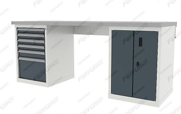 Верстак двухтумбовый 41.32106 окрашен глянцевым порошковым покрытием, обеспечивающим прекрасный внешний вид и простоту в уходе. Верстак оснащен: