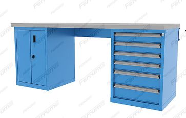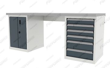 Столешница - фанера 43 мм, покрытый оцинкованным кожухом толщиной 1,5 мм. Возможна комплектация верстака другими типами столешниц Тумба 1: с дверью и 1 полкой Тумба 2: Ящик 460 х 460 х 83 h мм - 4 шт./Ящик 460 х 460 х 283 h мм - 2 шт. Тип направляющих - телескопические, развернутый подшипник Тип крепления- зацеп Выдвижение ящика - 92 % Ручка ящика -алюминиевый профиль с информационной вставкой Замок - центральный с блокировкой всех ящиков Количество ключей - 2 шт. Оснащен поперечной балкой Тип покрытия - порошковое эпоксидно-полиэфирное Цвет, RAL - 7001/7016; 5015