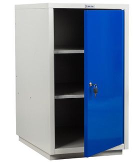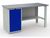верстак состоит из тумбы WD1 и опоры F1, тумба укомплектована 2-мя съемными регулируемыми полками и 1 дверцей, возможность смены стороны открывания двери ключевой замок на дверце тумбы, нагрузка на полку 30 кг. все ящики закрываются на центральный ключевой замок; ключевой замок на дверце тумбы, нагрузка на полку 30 кг.;максимальная нагрузка на верстак - 750 кг столешница верстака изготовлена из МДФ толщиной 24 мм покрытой оцинкованным листовым металлом толщиной 1,5 мм.; верстак окрашен порошковой краской, цвет покрытия корпуса серый шагрень (RAL 7038), лицевая панель дверцы тумбы – синий шагрень (RAL 5002); дополнительно верстак можно укомплектовать перфорированным экраном соответствующего размера, светодиодным освещением и аксессуарами для инструментов