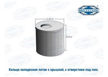 Кольцо колодезное литое с крышкой, с отверстием под люк. ПК 10.9: вес 850 кг, внутренний диаметр 100 см, наружный 116 см, высота 90 см. Установка бетонных колец осложнена тем, что необходимо обесп