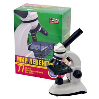 77 опытов с микроскопом Набор с микроскопом "Мир Левенгука" позволит заглянуть в таинственный и захватывающий мир микроорганизмов, узнать о том, как устроены растения, животные и грибы. Для школьников набор окажет неоценимую помощь при изучении курса биологии. Родителям поможет дать ответы на многие вопросы, например, о качестве продуктов. Объективов у микроскопа три — 4х-, 10х- и 40х-кратные. Их можно легко менять. Если перемножить значения увеличений окуляра и объектива, получим общее увеличение микроскопа: в 40, 100 и 400 раз. Чем больше увеличение, тем меньше рассматриваемый участок, а значит, тем меньше света попадает с него в объектив. Поэтому препараты нужно хорошо освещать. В микроскопе "Мир Левенгука" есть два типа освещения — верхнее и нижнее. Верхний свет используется только при работе с малым и средним увеличением. Он нужен для того, чтобы показать поверхность толстых срезов и непрозрачных препаратов (например, куска кирпича). Нижний свет подходит для прозрачных объектов (например, капель воды) и тонких срезов. Использовать его можно на всех трех увеличениях. Готовые препараты, вложенные в этот набор, лучше рассматривать под нижним светом. Что входит в комплект? Микроскоп с 40х, 100х и 400х-кратным увеличением Предметные и покровные стекла Чашка Петри Пипетка Пинцет Скальпель Препараты для изучения (срезы растений, лапка комара, ротовой аппарат пчелы, человеческие волосы и другие) Почему набор не только интересен, но полезен? Одно из ярких впечатлений детства — это открытие микроскопического мира. Каким удивительным кажется осознание того, что все вокруг состоит из клеток, а клетки в свою очередь компонуются из еще более мелких биологических "деталек". Даже обычная луковая чешуя под микроскопом переворачивает сознание юного натуралиста, который только начинает соприкасаться с этим микромиром. И неоспоримой помощью в постижении мира станет уникальный набор "Мир Лев