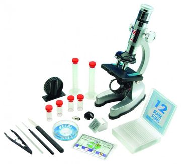 Микроскоп металлический в кейсе. Увеличение: 100х-1200х. В комплекте Микроскоп с цветными фильтрами Карточка с банком данных для исследований Мини-нож 12 заготовок для слайдов (стёкла, покрытия и ярлычки) Чашка Петри с лупой 2 градуированных пробирки с крышками 4 пузырька с крышками Пинцет Скальпель Шило Стеклянная палочка для помешивания Защитный колпачок для окуляра Инструкция на русском языке Запасная лампочка Высота микроскопа: 23 см. Батарейки 2хАА (в комплект не входят). None