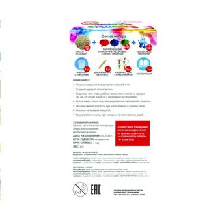 Абсолютная новинка — научно-познавательный набор от "Лепы". С ним ребенок из обычного кинетического песка самостоятельно может сделать цветной! Поможет ему в этом подробная инструкция внутри. Теперь ваш ребенок может стать настоящим волшебником! Песок "Лепа" с минеральными красителями — это первый цветной песок, окрашенный не химическим способом, а природным компонентом. Впервые пески можно смешивать по принципу колористики и мгновенно получать новые цвета. Возьмите желтый и красный, смешайте, и вот уже в ваших руках оранжевый! Трогательный песок долговечный и полностью безопасный. "Лепа" не боится ни воды, ни грязи, ни даже жира. Его легко промывать, легко собирать после игры. Трогательный песок на 90% состоит из обычного кварцевого песка, и на 10% из связующего полимера, который и придает ему его волшебные физические свойства. Так же используется безопасная антисептическая добавка, которая не дает развиваться бактериям в песке. Есть много исследований о прямой связи развития мелкой моторики рук и умственных способностей. Так что играя с трогательным песком дети развиваются умственно. Так же известно, что творческая реализация имеет прямое влияние на социальную адаптацию. С помощью трогательного песка ваши дети становятся умнее и успешнее. Игра с кинетическим песком развивает мелкую моторику, которая напрямую связана с речевой функцией, и в итоге помогает развитию мышления. Проще говоря — песок помогает ребенку умственно развиваться. "Лепа" подходит детям любых возрастов. Для совсем маленьких детей он способствует развитию мелкой моторики, для детей постарше — раскрывает творческий потенциал. Многие наши взрослые сотрудники пользуются песком для расслабления, как антистресс игрушкой. None
