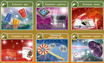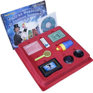Ловкость рук и никакого мошенничества! С этим набором волшебного реквизита даже начинающий маг может подготовить целое представление. В наборе вы найдёте реквизит для 6 удивительных фокусов, DVD и инструкцию с показом и объяснением того, как эти фокусы делаются: Египетское чудо. Шарик загадочным образом проходит сквозь дно стаканчика. Волшебная коробочка. Разорванная карта кладётся в коробочку, а затем извлекается абсолютно целой! Летающие спички. Фокусник берет карту и кладет на нее спичку, и спичка начинает парить над картой. Угадывание карты. Какую бы карту не загадал зритель, фокусник всегда её достанет из колоды. Карманный монетный двор. На пустой лопатке снова и снова появляются монетки. Летающая тарелка. Внутри "летающей тарелки" невероятным образом вместо маленького кубика появляется большой. Предлагаемые фокусы скрасят любой праздник! Освоив их, любой ребенок сможет почувствовать себя магом, провести уникальное представление и удивить окружающих! None