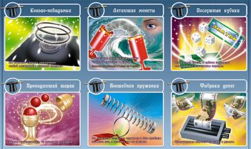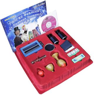 Ловкость рук и никакого мошенничества! С этим набором волшебного реквизита даже начинающий маг может подготовить целое представление. В наборе вы найдёте реквизит для 6 удивительных фокусов, DVD и инструкцию с показом и объяснением того, как эти фокусы делаются: Кольцо – невидимка. Вы сможете сделать невидимым любой маленький и плоский предмет. Например, монетку. Летающие монетки. Загадочное перемещение монет из одной рюмочки в другую. Послушные кубики. Один взмах рукой и кубики внутри коробки послушно выстраиваются в нужном порядке. Пропадающий шарик. Шарик то появляется, то исчезает из рюмки. Прямо под носом у зрителей. Волшебная пружинка. Вы наденете кольцо на пружинку и без проблем снимете его, а зритель так не сможет. Фабрика денег. Превращение обычной бумажки в банкноты. Предлагаемые фокусы украсят любой праздник! Освоив их, любой ребенок вызовет уважение одноклассников! None