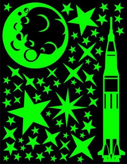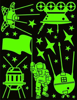 - Светящиеся в темноте наклейки для оформления потолка (2 листа) с изображениями: Луны, космической станции "Луна — 2" и "Луна — 3", космического корабля США "Аполлон — 11", астронавта и "Лунохода", а также несколько разных видов больших и маленьких звезд. Наклейки легко и прочно наклеиваются на любую поверхность и светятся нежно- салатовым цветом, создавая в комнате эффект волшебства и красоты звездного неба. А главное, создается эффект спокойствия и безопасности, благодаря чему ваш ребенок будет с удовольствием самостоятельно готовиться ко сну, любоваться звездным небом, которое он создал своими руками, и легко засыпать в комнате с выключенным светом